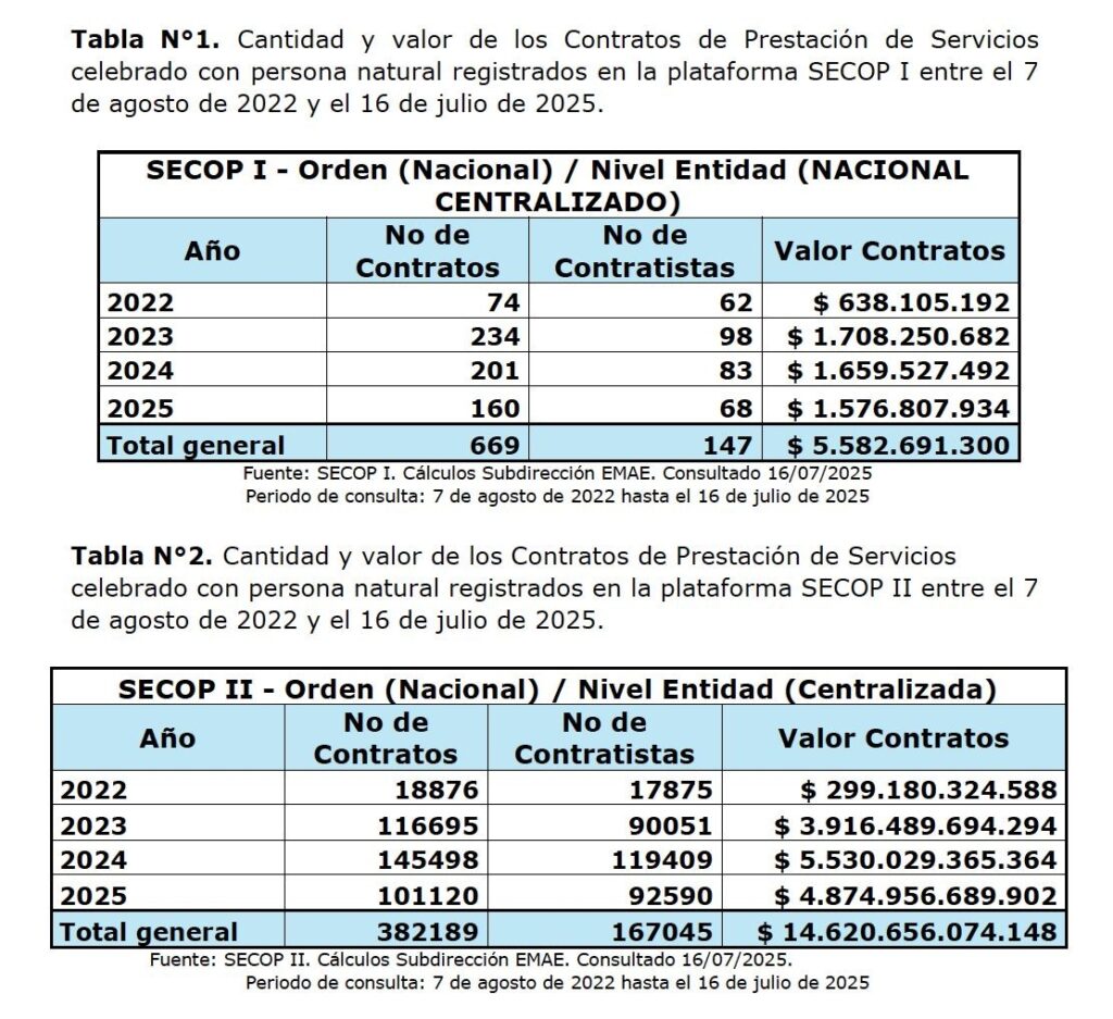 Entre el 7 de agosto de 2022 y el 16 de julio de 2025, el gobierno de Gustavo Petro ha suscrito contratos de prestación de servicios con personas naturales por cifras históricas, según información oficial del Sistema Electrónico de Contratación Pública (SECOP). En el nivel nacional centralizado, se registraron 669 contratos en SECOP I por $5.000 millones y 382.189 contratos en SECOP II por $14,62 billones, vinculando a más de 167.000 contratistas. Este fenómeno refleja un uso masivo de órdenes de prestación de servicios (OPS), lo cual suscita debates sobre la responsabilidad fiscal, eficiencia y legalidad dentro de la actual crisis que vive el país.
